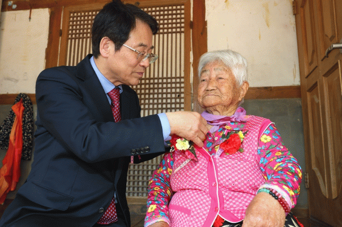 강진원 군수는 직접 전 어르신께 붉은 카네이션을 옷깃에 정성껏 달아드리며 안부를 묻는 순간은 지켜보던 이들의 가슴을 뭉클하게 만들었다.