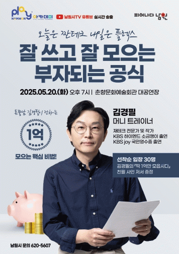 김경필 강사는 『KBS 하이엔드 소금쟁이』, 『KBS joy 국민영수증』 등 다수의 재테크 예능 프로그램에서 현실적인 경제적 해결책을 제시하는 ‘재테크 멘토’로 활약해 왔으며, 이번 강연을 통해 방송에서 강조했던 실생활에 바로 적용할 수 있는 맞춤형 재테크 팁에 대해 남원시민에게 자세하게 설명할 예정이다.