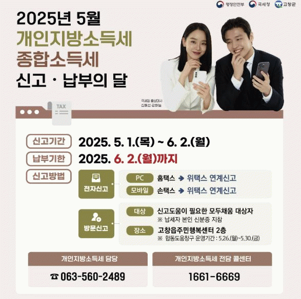고창군 관계자는 “납세자의 불편 및 혼란 최소화를 위해, 합동도움창구 방문 시 반드시 납세자 본인 신분증과 모두채움안내문을 지참 후 방문해 주시기 바란다”며 기한 내 신고·납부 해 줄 것을 당부했다.