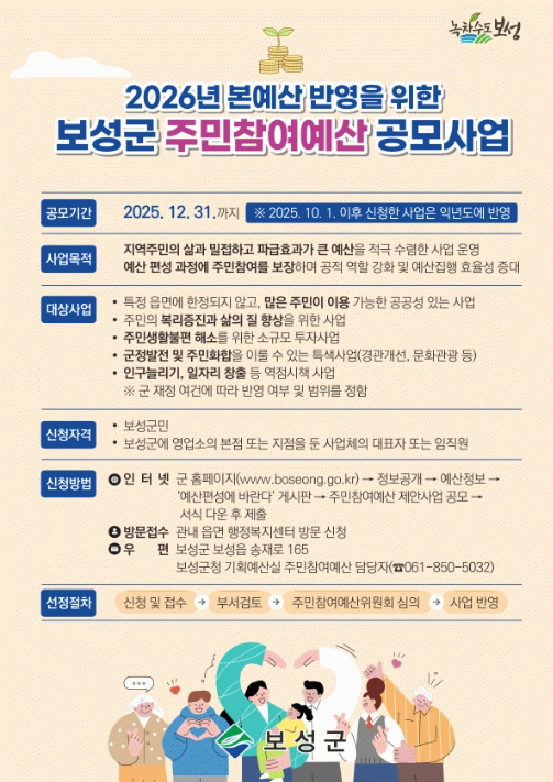 이번 공모는 주민의 삶과 밀접한 사업을 군민들이 직접 제안하고 예산에 반영함으로써, 보다 실질적인 주민 중심 행정을 실현하고, 살기 좋은 지역사회를 만들기 위해 마련됐다.