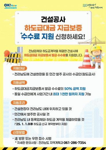 전남에서 시행되는 민간 발주 건설공사 중 지역 건설업체와 하도급 계약을 하고 지급보증서를 발급한 원도급사를 대상으로 발급 수수료의 50%(최대 1천만 원)를 지원하는 사업이다.