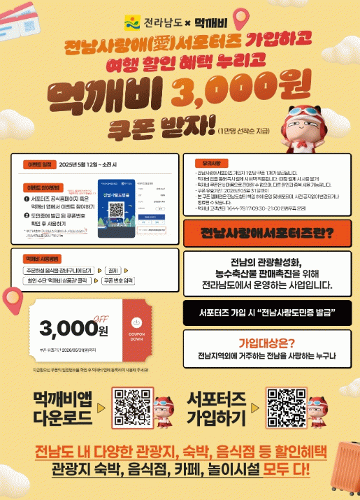 현재 ‘전남 사랑애 서포터즈’는 620여 제휴 가맹점 할인과 남도장터 쿠폰, JN투어 숙박 할인 등 다양한 혜택을 제공하고 있다.