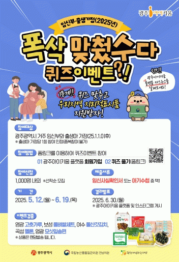 지원 대상은 임산부 또는 2025년 1월 1일 이후 출산한 가정이며, ‘광주아이키움’ 플랫폼을 통해 간단한 퀴즈를 풀고 임신확인서, 아기수첩 등 증빙서류를 제출하면 된다.