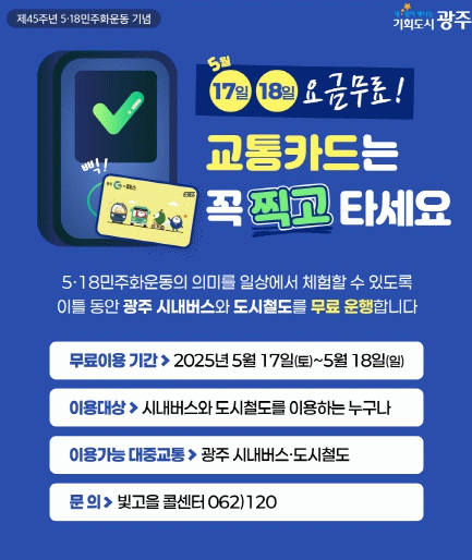 광주시는 지난해 첫 시행한 5월 18일 대중교통 무료승차 당시 시민들의 호응이 높았던 점을 반영, 올해는 5월 17~18일 이틀간으로 기간을 늘렸다. 이를 위해 시스템 정비, 운전원 교육, 안내 홍보 등 시행에 만전을 기했다.
