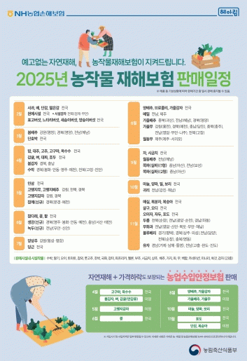 농작물 재해보험은 농업인들이 태풍, 우박, 동상해(언피해), 일소(햇볕 뎀) 등 다양한 자연재해로부터 농작물을 보호할 수 있는 제도이다. 가입 대상 농작물은 76종이며 보험에 가입할 수 있는 품목을 재배하더라도 품목별 파종 시기와 수확시기에 따라 가입 시기가 다르므로 재배작물의 가입 시기를 꼭 확인해야 한다.