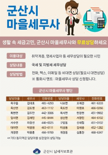 상담을 희망하는 주민은 군산시 누리집, 군산시 지방세 관련 창구 등에 비치된 홍보자료를 통해 ‘마을세무사’ 연락처 확인 후 전화·팩스·이메일을 통해 신청하면 된다.