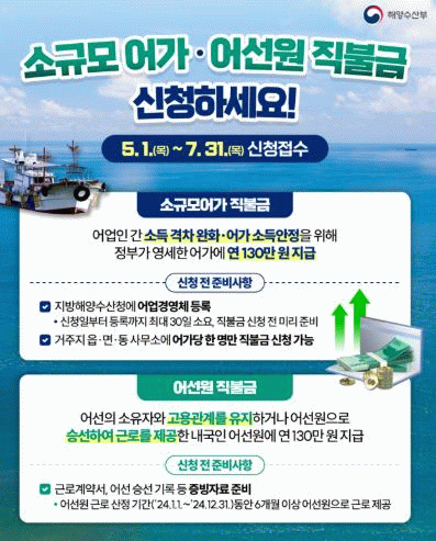 직불금 신청은 소규모어가는 거주지 읍․면사무소에, 어선원은 승선한 어선의 입출항 항구가 있는 읍․면사무소에, 조건불리지역은 위도면사무소에 신청하면 되는데 소규모 어가는 지난 해와 동일하게 어가당 한 명만 신청할 수 있으며, 지급대상은 5톤미만 연안어업 허가를 받은 어업인과 신고 어업인 등으로 직불금 신청일까지 어업경영체 등록을 완료해야 된다.