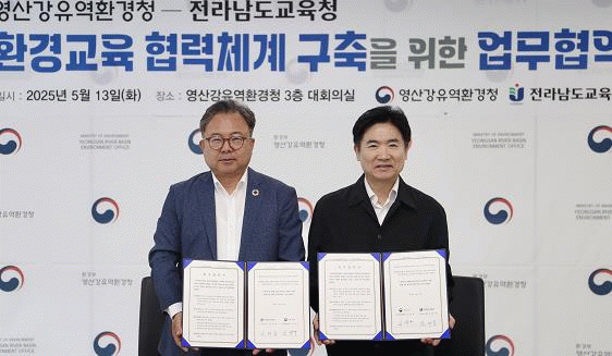 전라남도교육청과 영산강유역환경청은 13일 영산강유역환경청 대회의실에서 ‘환경교육 협력체계 구축’을 위한 업무협약을 맺고, 학생과 전문가가 함께하는 실천 중심 활동에 협력하기로 했다.