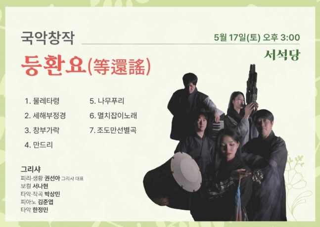 오후 3시 전통문화관 서석당에서 진행되는 ‘토요 상설공연’ 무대에서는 국악 노동요를 현대적으로 재해석한 음악공연 '등환요'가 펼쳐진다. 노동요는 단순한 노래가 아닌, 선창과 후창을 통해 선조들의 삶과 정서를 담아낸 민중의 음악으로, 고된 노동과 배고픔 속에서도 분노와 항의, 희망과 연대를 노래하며 이어온 소리다. 이번 무대는 다양한 세대가 함께 노동요를 부르며 공감하고 소통할 수 있도록 기획됐으며, 창작그룹 ‘그리샤’가 국악을 통해 음악적 위로와 쉼을 선사한다.