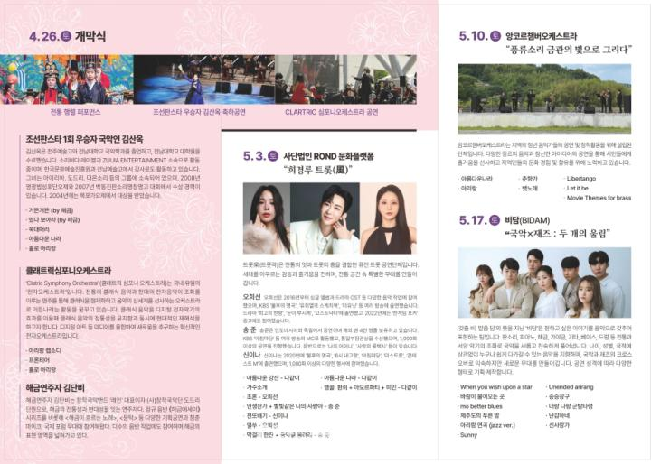 전통문화관 다음 공연은 5월 24일로, ‘토요 상설공연’에서는 무형유산 초청 무대 <문명자의 가야금병창 다섯마당>, ‘희경루 풍류소리’에서는 <단미의 희경루 연가> 무대를 선보일 예정이다.