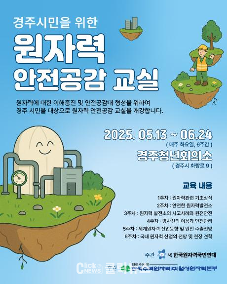 6주간 진행되는 원자력 안전공감 교실은 (사)한국원자력국민연대가 주최/주관하고 한국수력원자력(주) 월성원자력본부 지원사업으로 경주시민을 위한 교육 프로그램 이다.