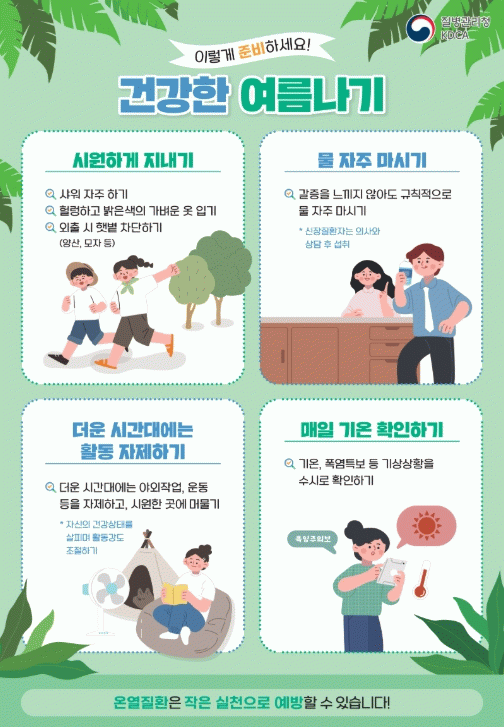 올여름은 평년보다 무더운 날이 많을 것으로 예보됨에 따라 안전하고 건강한 여름나기를 위해서는 미리 기온을 확인해 폭염 시 외출을 자제하거나 양산이나 모자 등으로 햇볕을 차단하고, 충분한 휴식과 수분 섭취 등 폭염 대비 건강수칙을 잘 지켜야 한다.