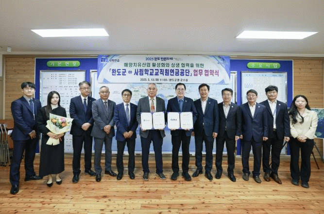 협약식은 지난 5월 13일 완도군청에서 진행됐으며, 신우철 완도군수와 송하중 이사장을 비롯한 관계자들이 참석했다.