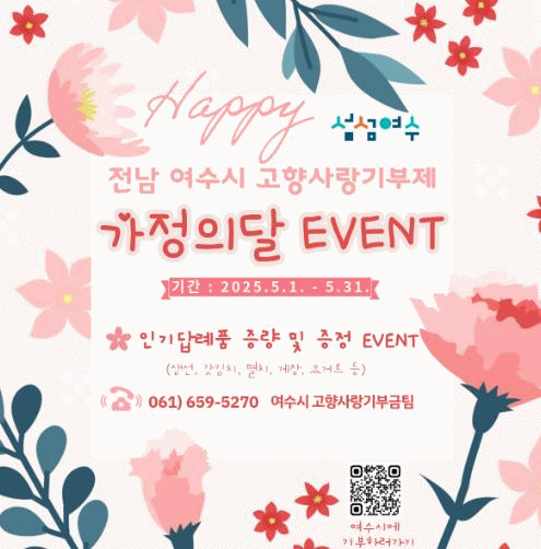 시 관계자는 “기부 한 건 한 건이 지역 경제를 살리는 큰 힘이 된다”며 “가족과 고향에 대한 의미가 더 특별해지는 5월을 맞아 준비한 깜짝 이벤트를 활용해 고향사랑기부제에 더 많은 분이 동참해 주기를 바란다”고 전했다.