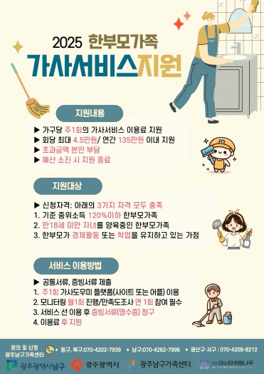 ‘한부모가족 가사서비스 지원사업’은 자격요건을 갖춘 한부모가족을 대상으로 주 1회 가사서비스 이용료를 지원한다. 회당 4만5000원씩 연 최대 135만원 한도 내에서 지원한다. 초과 비용은 자부담이며, 예산이 소진되면 지원이 종료된다.