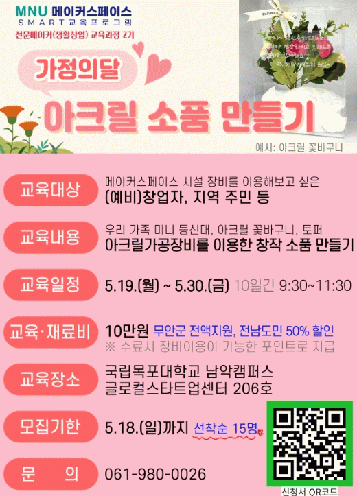교육은 18일까지 선착순 모집하며 예비·초기 창업자와 제조 관련 기업, 대학생 및 지역 주민 등 만들기와 창업에 관심 있는 누구나 참여할 수 있다.