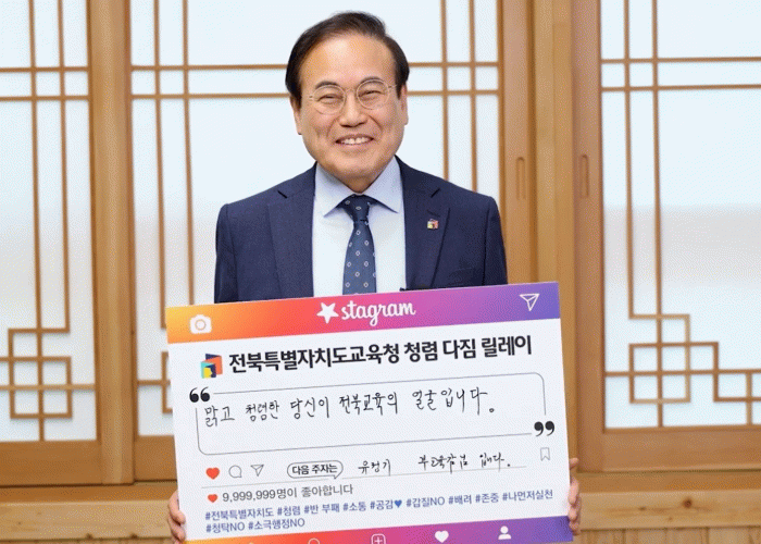 서 교육감은 “맑고 청렴한 당신이 전북교육의 얼굴입니다”라는 청렴 메시지를 직원들에게 전달하고, 다음 주자로 유정기 부교육감을 지목했다.