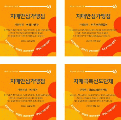 영광군은 현재 치매 극복 선도 단체 14개소, 치매 안심 가맹점 9개소를 지정해 관리 중이며, 이를 지속적으로 확대해 지역 내 촘촘한 치매 안전망을 구축해 나갈 계획이다.