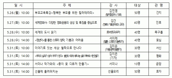 먼저 건지도서관은 오는 26일 오전 10시, 김민영 컬러힐컴퍼니 대표를 초청해 ‘행복한 부모를 위한 컬러테라피’를 주제로 부모교육특강을 진행한다.