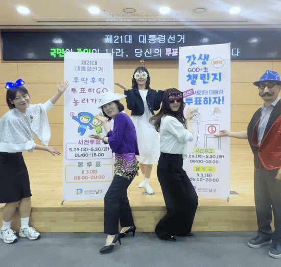 남구 관계자는 “우리 모두의 희망인 아름답고 행복한 나라를 만들기 위해 대통령 선거 투표 참여를 위한 다각적인 홍보를 진행 중이다”면서 “우리가 바라는 세상은 나의 선택에서 시작되며, 그 시작은 참정권 행사에 있다”고 밝혔다.