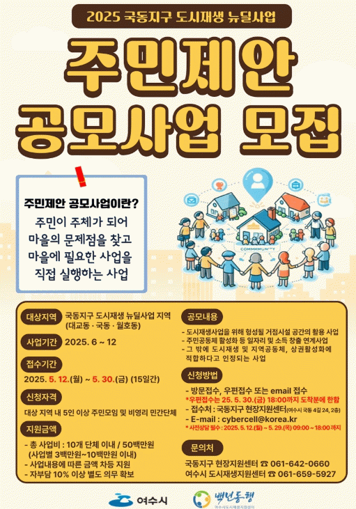 공모와 관련된 자세한 사항은 여수시 도시재생지원센터 블로그 또는 여수시 누리집 고시공고에서 확인하거나 국동지구 도시재생현장지원센터 또는 여수시 도시재생지원센터로 문의하면 된다.
