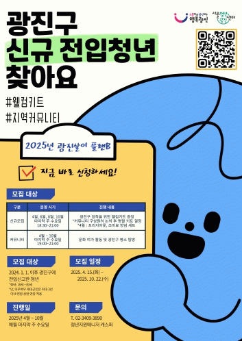 주요 내용은 ▲문화 여가 활동‧광진구 명소 탐방 등 ‘청년 커뮤니티’ 운영 ▲‘웰컴키트’ 제공 ▲청년 지원 제도‧정책 안내 등이다. 오는 10월까지 매달 커뮤니티 활동을 진행하며, 짝수달마다 생필품으로 구성된 ‘웰컴키트’를 전달할 예정이다.
