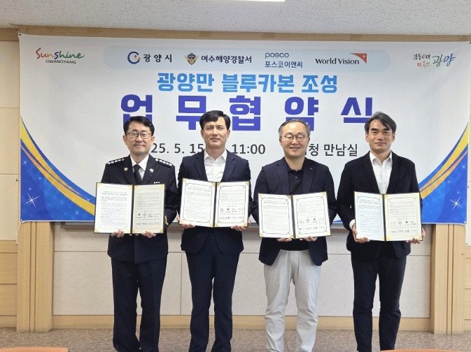 시는 5월 15일 시청 만남실에서 여수해양경찰서, 포스코이앤씨, 월드비전과 함께 ‘광양만 블루카본 조성’을 위한 업무협약을 체결했다고 밝혔다.
