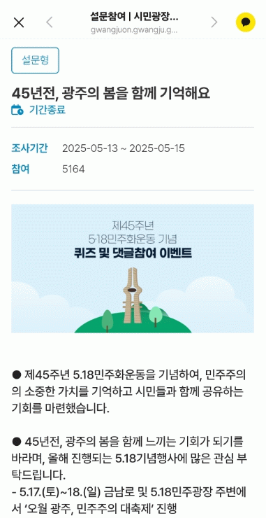 광주광역시는 지난 13일부터 15일까지 광주온에서 ‘45년 전, 광주의 봄을 함께 기억해요’를 주제로 퀴즈 풀기 및 댓글 참여 이벤트를 진행, 총 5100여명의 시민이 참여했다.
