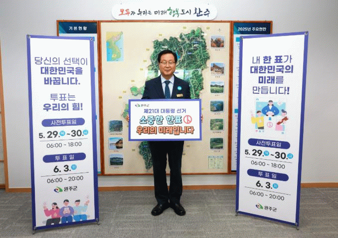 유희태 완주군수는 “이번 제21대 대통령선거가 공정하고 투명하게 치러지길 바라며, 군민 여러분께서도 소중한 한 표를 행사해 더 나은 대한민국을 만드는데 함께해 주시기를 바란다”고 말했다.