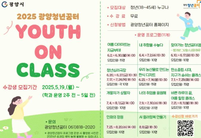 오영숙 광양청년꿈터 센터장은 “유스 온 클래스가 청년들에게 실질적인 도움이 되는 배움의 장이자 다양한 생각과 경험이 모이는 건강한 커뮤니티로 자리 잡기를 기대한다”며 “앞으로도 청년들의 눈높이에 맞춘 다양한 프로그램을 지속적으로 발굴・운영해 나가겠다”고 밝혔다.
