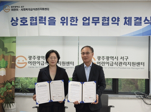 협약식에는 노형근 광주김치타운관리사무소장, 허영란 광주서구어린이·사회복지급식관리지원센터장 등이 참석해 상호협력 방안을 논의했다.