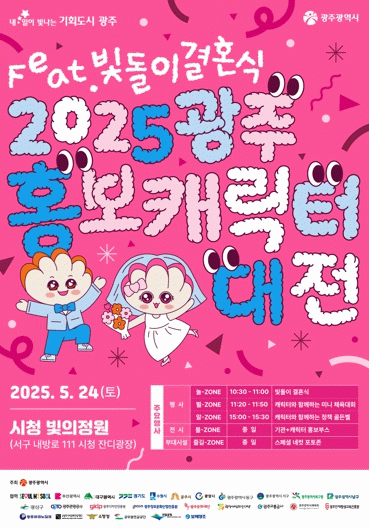 광주광역시는 오는 24일 오전 10시30분 시청 앞 빛의 정원에서 광주시 대표 홍보캐릭터인 ‘빛돌이’와 여자친구 ‘빛나영’의 결혼식을 콘셉트로 한 ‘2025 광주 홍보캐릭터 대전’을 개최한다.