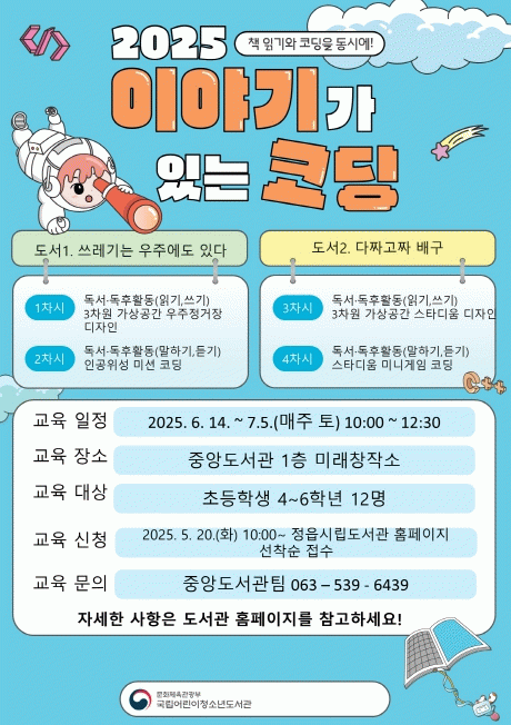 송현숙 도서관운영과장은 “책과 코딩이 융합된 이번 체험활동을 통해 어린이들이 독서의 새로운 즐거움을 알아가고, 논리적인 사고력과 문제 해결 능력, 창의성을 키우는 데 큰 도움이 되기를 바란다”며 “앞으로도 어린이들을 위한 다양하고 유익한 프로그램을 마련하겠다”고 전했다.