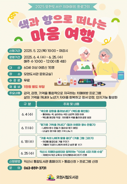 익산시는 모현도서관에서 오는 6월 한 달간 실버세대를 위한 치매 예방 프로그램 '색과 향으로 떠나는 마음 여행'을 운영한다고 19일 밝혔다.