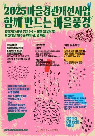 ‘마을경관개선사업 – 함께 만드는 마을풍경’사업은 완주군이 지난 2021년부터 추진해온 공동체문화도시사업의 일환으로, 도시재생의 사각지대를 주민 주도로 개선하고 마을 고유자원과 연계한 경관특성화를 도모하는 사업이다. 올해는 총 12개 마을을 선정하여, 마을당 500만 원에서 최대 1,000만 원까지 차등 지원된다.