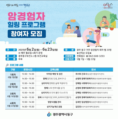 프로그램은 회당 20명 내외로 운영되며 이달 30일까지 관내 재가 암 환자와 암 경험자를 대상으로 사전 예약 접수를 받고, 참가비는 전액 무료다.