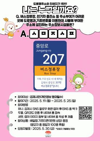 조원태 민원지적과장은 “이번 SNS 초성퀴즈 이벤트를 통해 주소정보시설에 대한 시민들의 관심을 더욱 높일 수 있도록 시민들이 직접 참여하는 홍보 정책을 지속적으로 추진해 나갈 것”이라고 말했다.