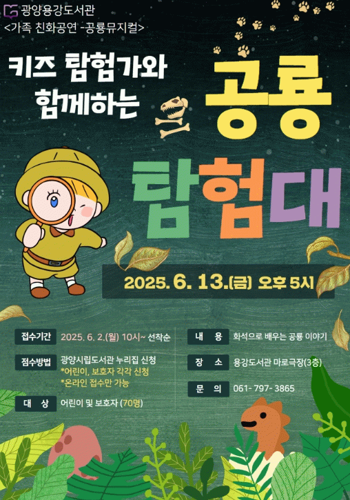 김미라 도서관과장은 “어린이들이 좋아하는 ‘공룡’이라는 소재를 활용해 아이들의 관심과 흥미를 유도함은 물론 유익한 내용을 통해 지식을 쌓는 데 도움이 되도록 기획했다”며 “이번 뮤지컬이 가족 모두에게 소중한 추억이 되길 바란다”고 전했다.