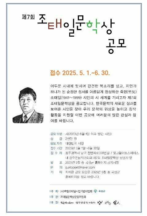 (사)죽형조태일시인기념사업회와 곡성군이 주최하고, 한국작가회의, 광주전남작가회의, 창비, 문학들이 후원하는 '제7회 조태일문학상' 접수 기간은 5월 1일부터 6월 30일까지 2개월간이며, 최근 2년 이내(2023년 6월 1일 이후)에 발간한 시집을 시인 본인이 등기우편으로 제출하거나 추천위원의 추천을 통해 응모할 수 있다.
