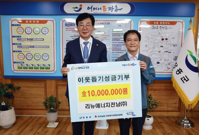 장흥군 관계자는 “지역을 위한 나눔에 앞장서 준 리뉴에너지전남(주)에 깊이 감사드린다”며, “기탁해 주신 성금은 도움이 절실한 이웃들에게 투명하고 소중하게 전달하겠다”고 밝혔다.