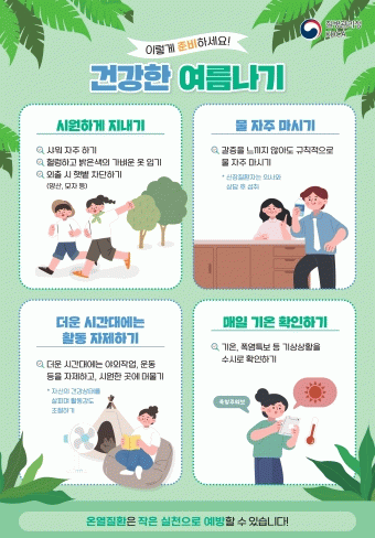온열질환은 ▲물 자주 마시기 ▲외출 시 햇볕 차단하기(양산, 모자 등) ▲헐렁하고 밝은색의 가벼운 옷 입기 ▲더운 시간대에는 야외작업, 운동 자제하고 시원한 곳에 머물기 ▲기온, 폭염특보 등 기상 상황 수시로 확인하기 등의 건강 수칙 실천을 통해 예방할 수 있다.