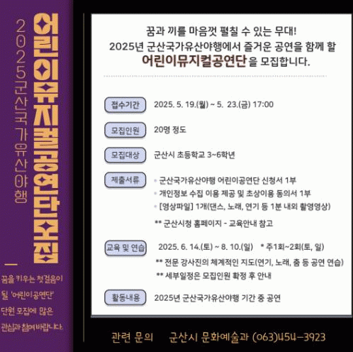 군산시에서 최초로 시도하는 ‘어린이 뮤지컬 공연단’은 관내 초등학교 3학년 ~6학년을 대상으로 20명을 선정할 예정이다.