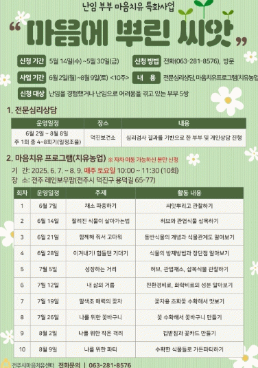 김신선 전주시보건소장은 “이번 프로그램은 단순한 여가활동을 넘어 과학적으로 검증된 심리치유 기법과 농업 활동을 결합한 통합 치유 모델”이라며 “난임 부부들이 함께 어려움을 극복하고 희망을 되찾는 계기가 되기를 바란다”고 전했다.