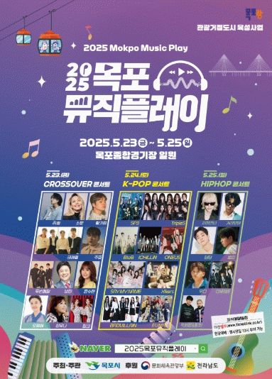 2025 목포 뮤직플레이는 ‘목포, 음악이 되다♬ Bring the music back to Mokpo’라는 주제로 목포종합경기장 일원에서 K-pop 공연, 음악·댄스 경연, 전시·체험 부스 등 다채로운 프로그램이 펼쳐질 예정이다. 23일 오후 7시에 열릴 개막식 공연을 시작으로 목포가 음악으로 물드는 3일간의 여정이 시작된다.