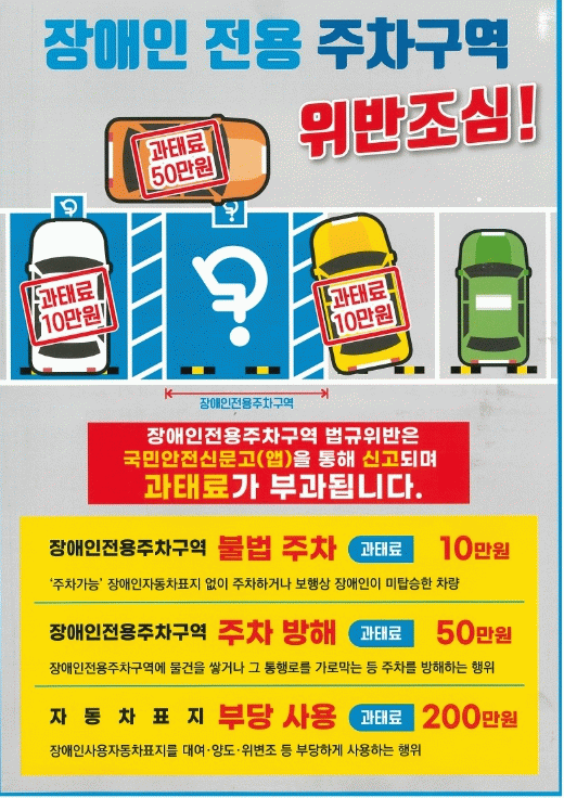 영광군 관계자는 “사소한 부주의나 실수로 인해 과태료가 부과되는 일이 없도록 잘 지켜주길 바라며 군에서도 장애인전용주차구역의 올바른 이용과 홍보에 최선을 다하겠다”고 말했다.