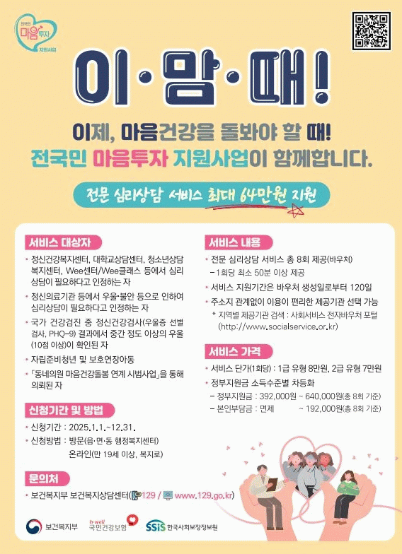 시 보건소 관계자는 “심리적 어려움은 누구에게나 찾아올 수 있는 문제”라며 “전국민 마음투자 지원사업이 정읍 시민들의 마음 건강을 지키는 실질적인 지원이 되기를 바란다. 앞으로도 시민이 스스로 몸과 마음의 건강을 돌볼 수 있는 여건을 조성해 나가겠다”고 밝혔다.