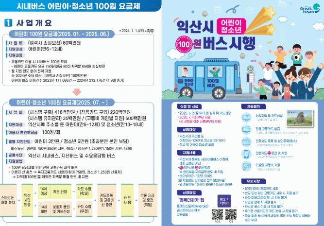 익산시는 기존에 어린이(6~12세)를 대상으로 추진해 온 '100원 버스 요금제'를 오는 7월부터 청소년(13~18세)까지 확대 적용한다고 21일 밝혔다.