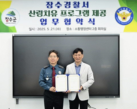 이번 협약은 경찰공무원의 정신적, 신체적 건강증진을 위해 장수군이 운영하는 ‘장수 치유의 숲’ 프로그램 등 산림치유 서비스를 제공하기 위해 추진됐다.