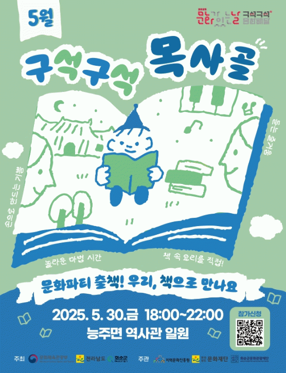 5월 30일 열리는 ‘구석구석 목사골; 문화파티 출책!’은 오후 6시부터 10시까지 능주면 역사관 일대에서 펼쳐지며, 책을 테마로 한 다채로운 체험과 공연이 준비돼 있다.