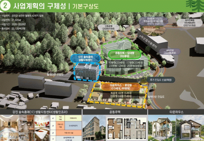 강진군의 ‘숲속품애 마을’ 조성 사업은 폐교된 성화대학 부지(2만1천620㎡)에 70세대(공동주택 60세대·타운하우스 10세대)의 주거단지와 키즈카페, 도서관 라운지, 커뮤니티시설, 스파 등 복합 타운을 조성할 계획이다. 2028년까지 4년간 231억 원(국비 132억 원)이 투입될 예정이다.